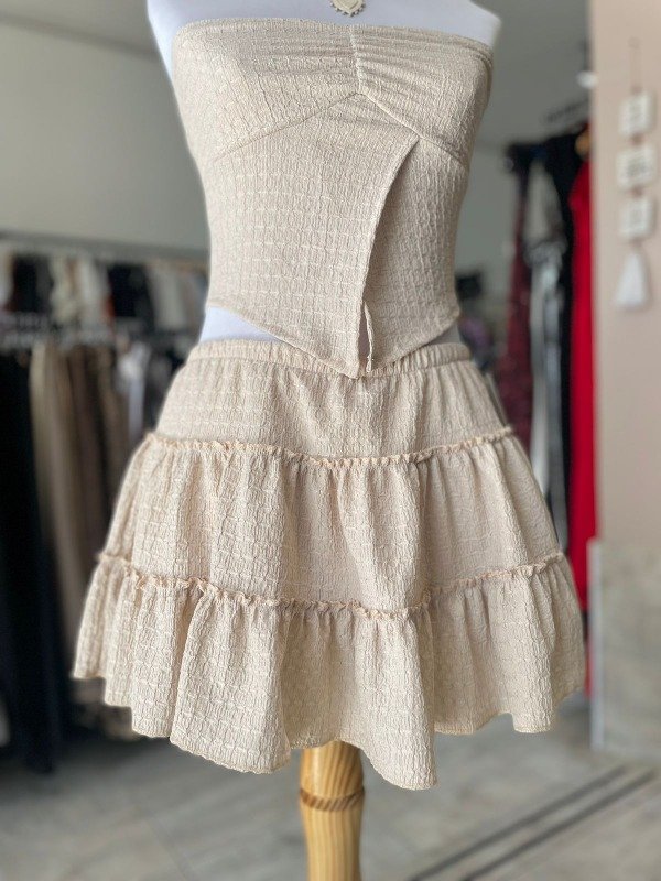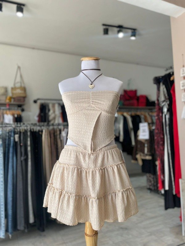 Falda de tela 50% poliester 50% viscosa., con short abajo elastizado. Talle único (38/40)