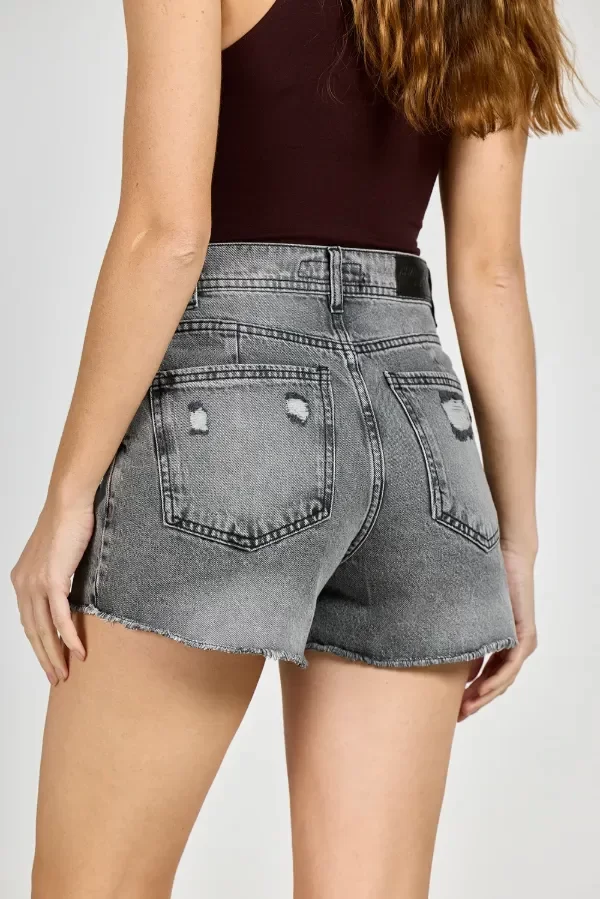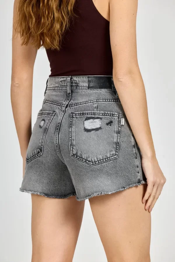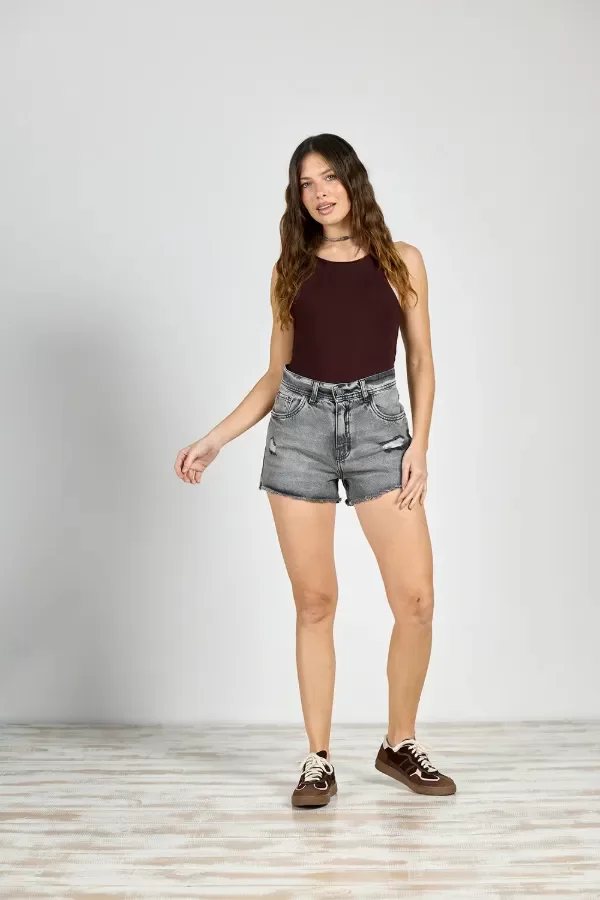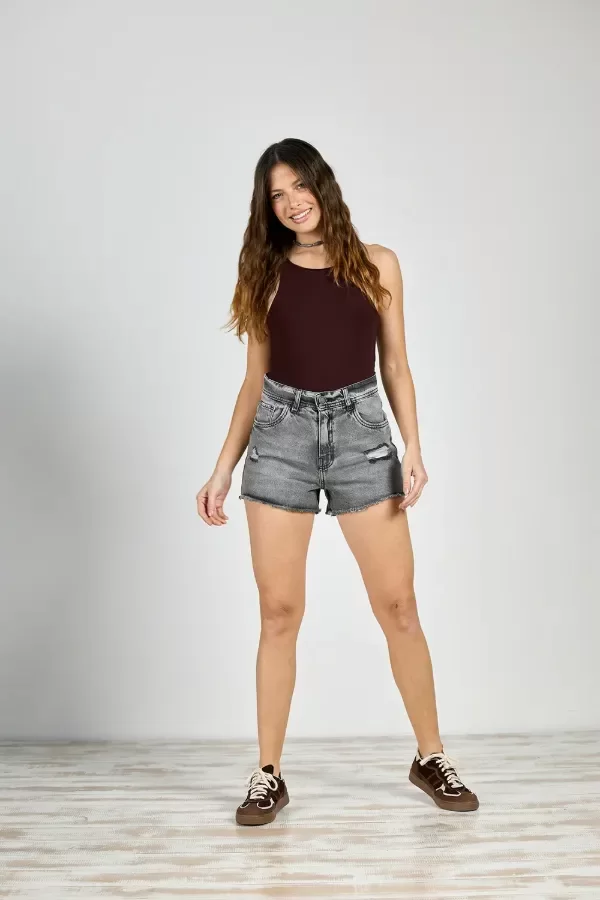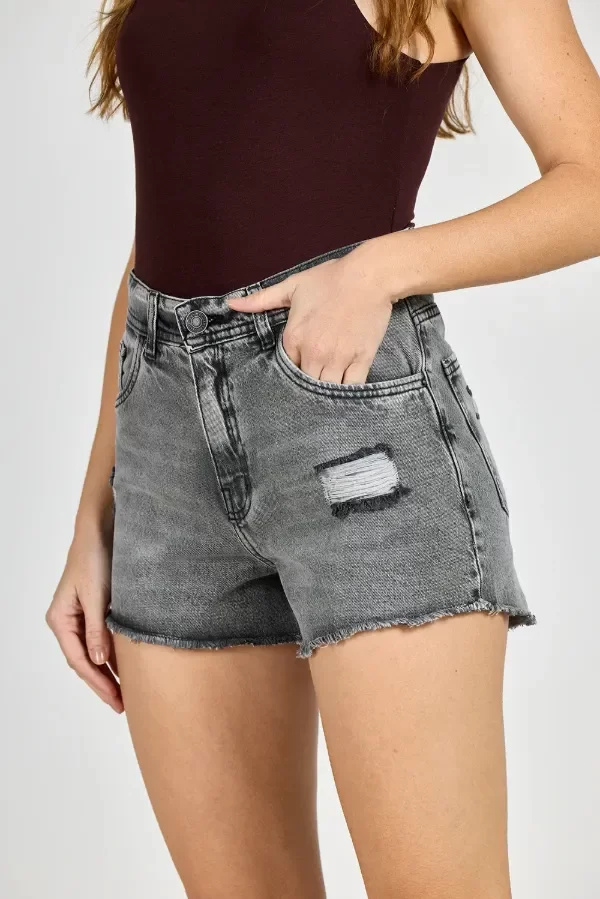 Short de jean rígido, corte tiro alto con detalle de roturas y desflecado.