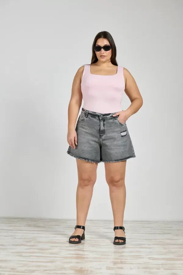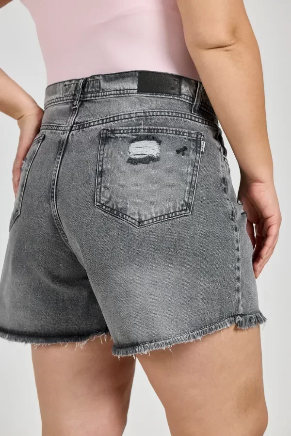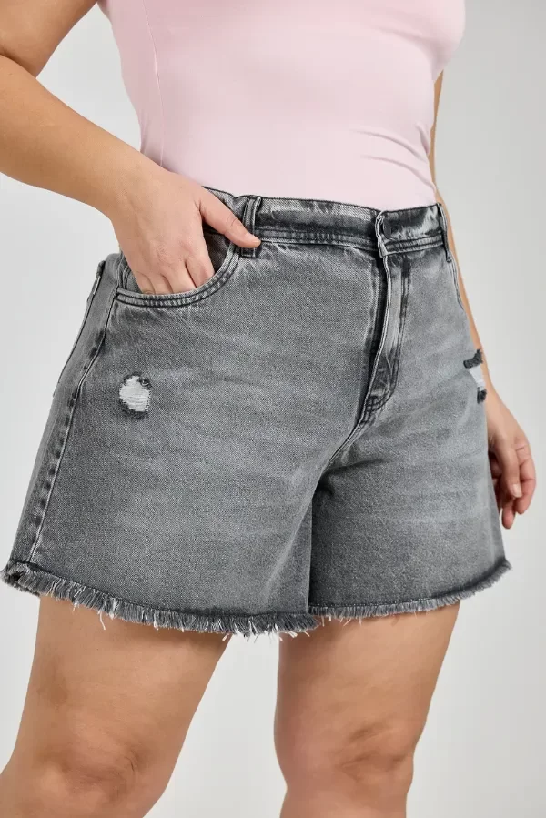 Short de jean rígido, corte tiro alto con detalle de roturas y desflecado.